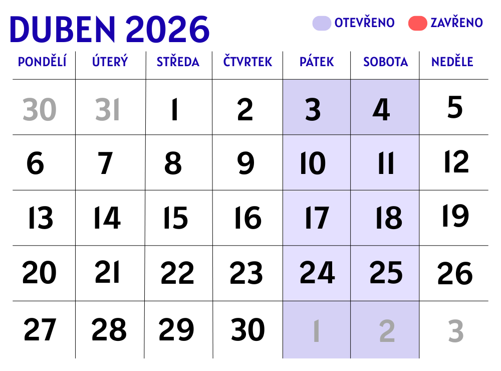 Duben: otevřeno Květen: otevřeno Červen: otevřeno, od 26.6. do 12.7 DOVOLENÁ ZAVŘENO Červenec: od 17.7. otevřeno pro podrobnější znázornění viz. obrázek